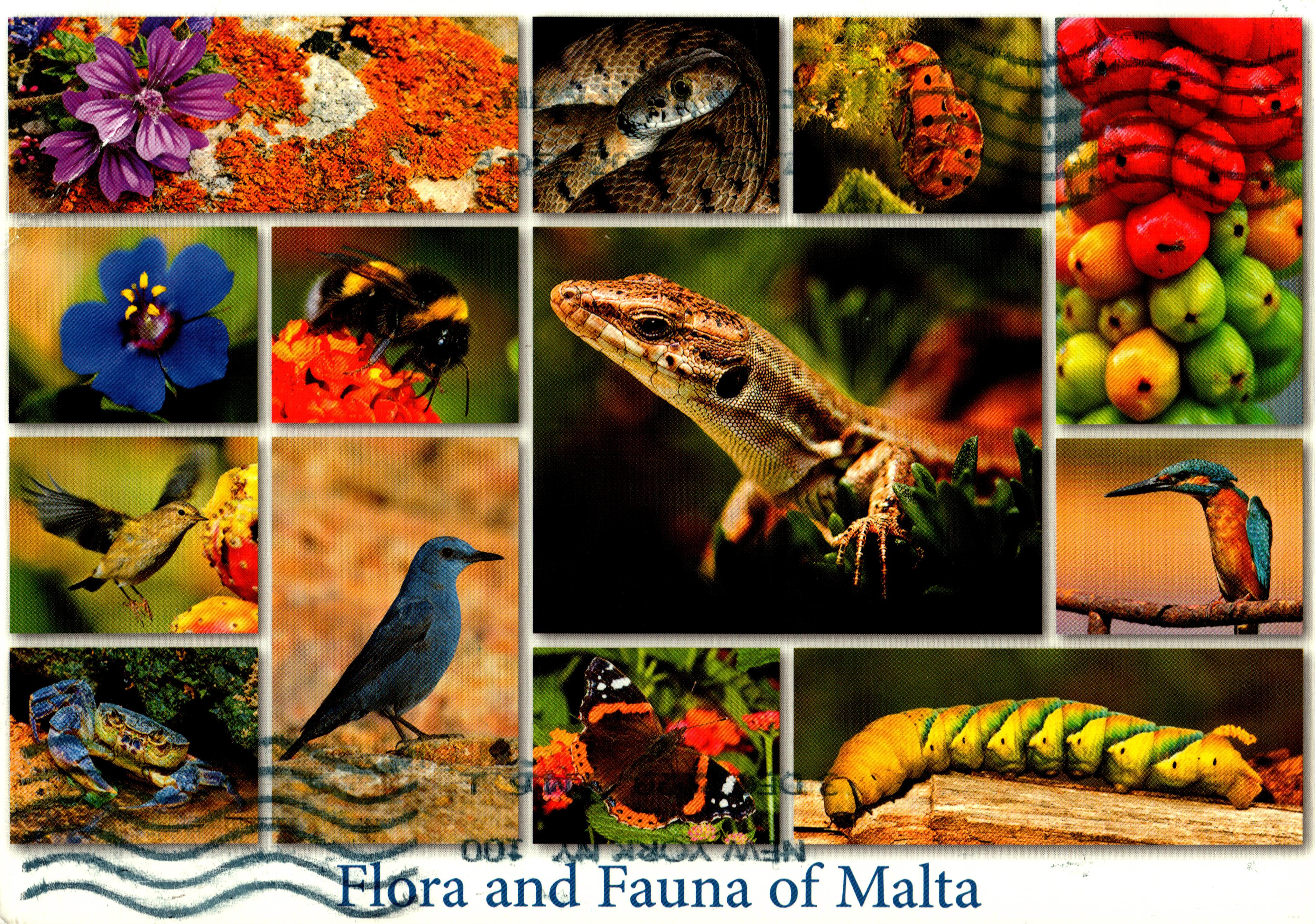 FilflaFlora and Fauna of Malta (Common Mallow, Algerian Whip Snake, Gourd Ladybird, Italian Lords-and-Ladies, Kingfisher, Caterpillar, Red Admiral, Blue Rock Thrush, Fresh-water Crab, Chiffchaff, Blue Pimpernel, Bumble-bee, Maltese Wall Lizard)