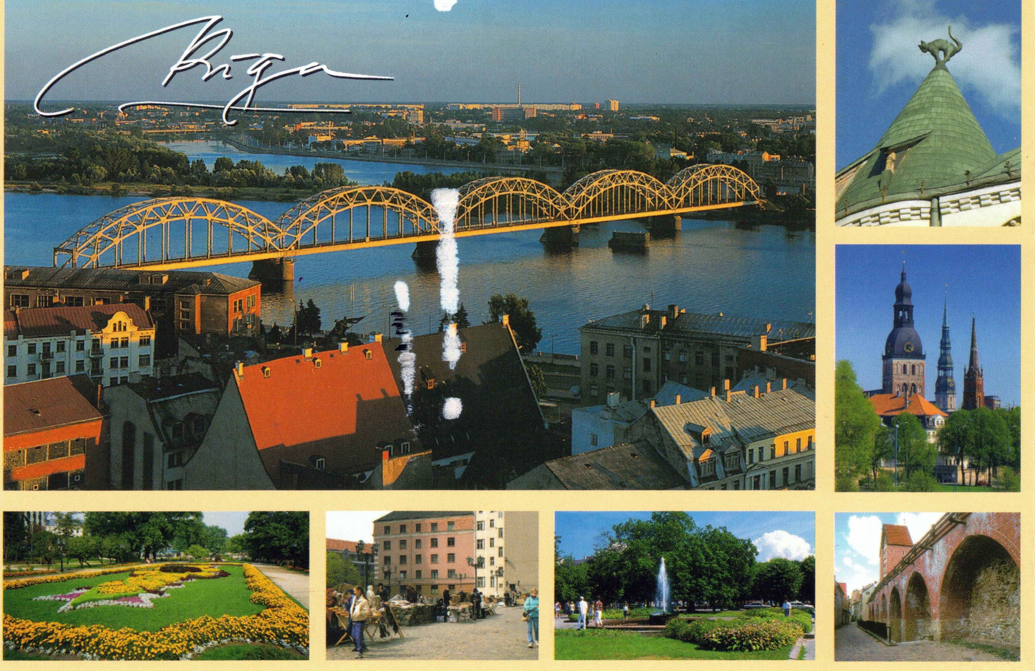 Train bridge across the river Daugava, Skarnu Street, Cat house, Towers of Riga, RigaRiga