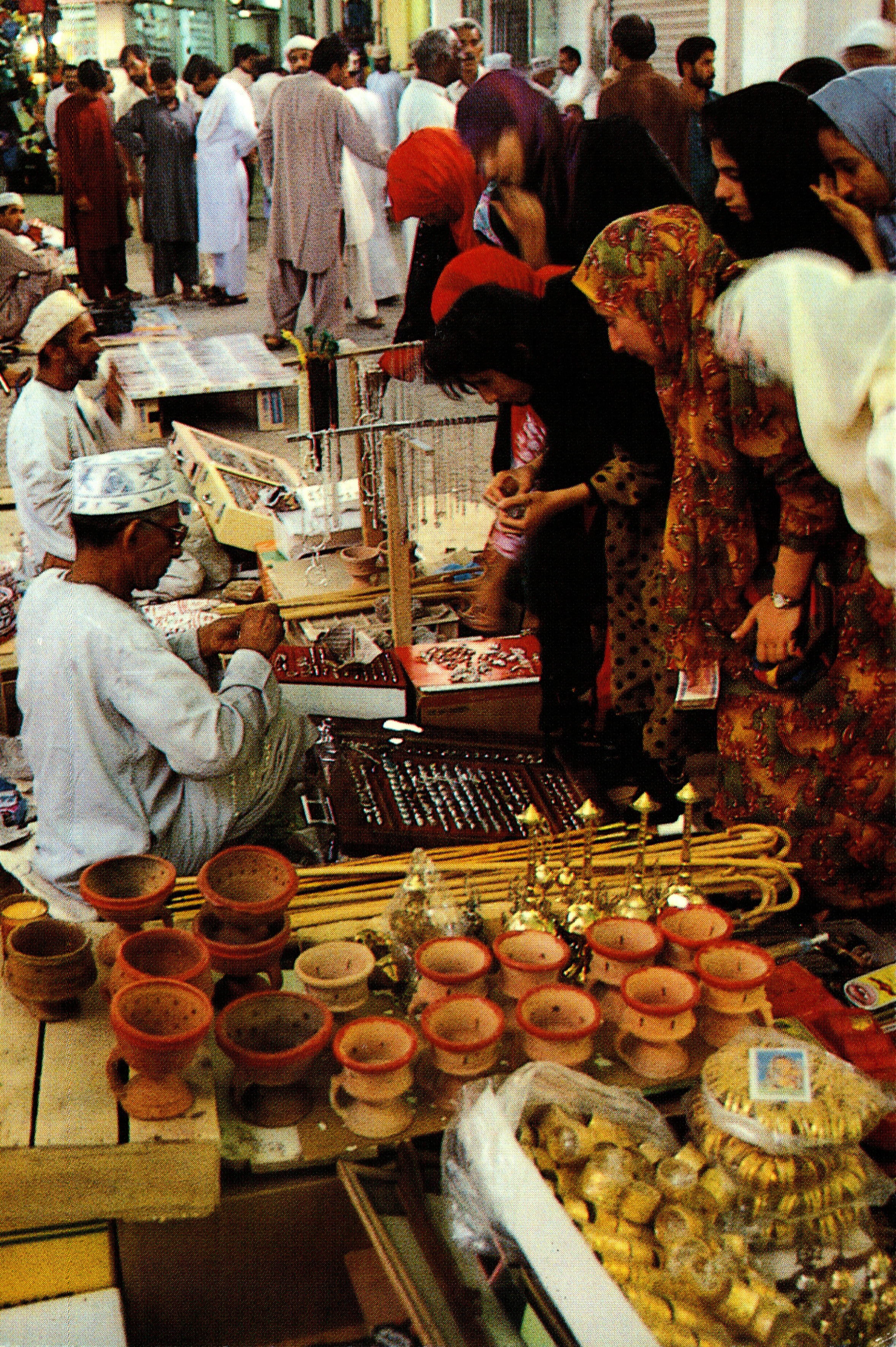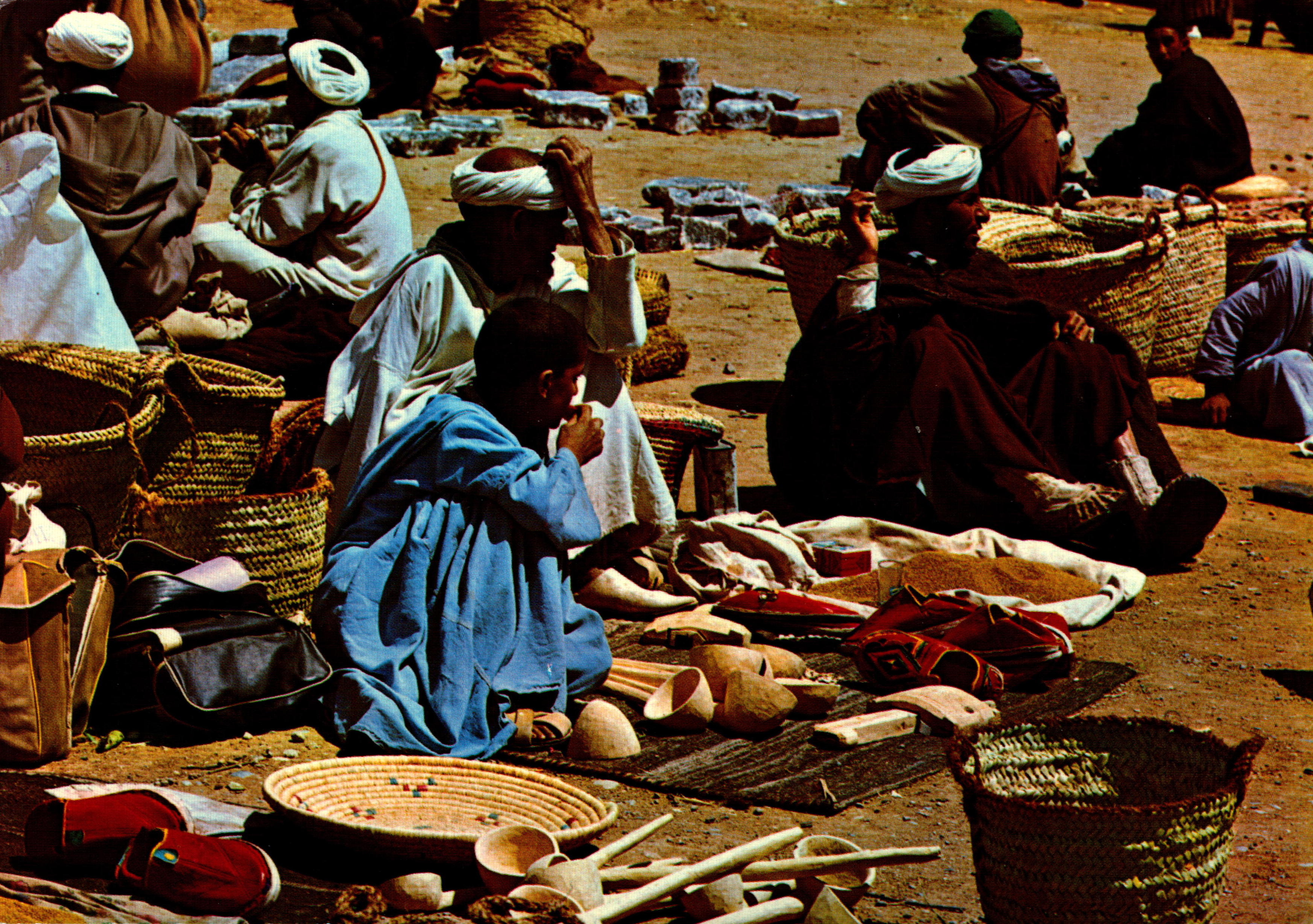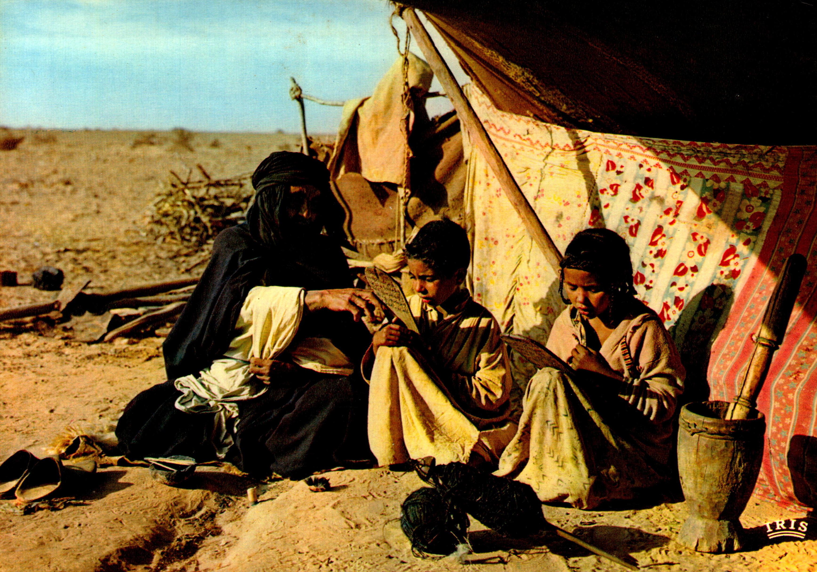 Nomads’ tents in the heart of the desertTeacher and pupils reading the QuranSouvenir shop